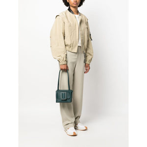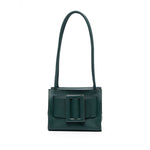 Bobby 18 leather shoulder bag from BOYY featuring teal blue, calf leather, grained texture, decorative buckle detail, engraved logo, top zip fastening, two long top handles and main compartment. Bobby 18 Soft leather handbag Size and Fit - Width 7,09 in / 18 cm