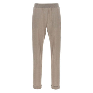 taupe grey elasticised waistband cuffed hems tapered leg design Wool and silk trousers Size and Fit - This piece fits true to size. We recommend you get your regular size. Model is 1,75m / 5ft 8in wearing size S