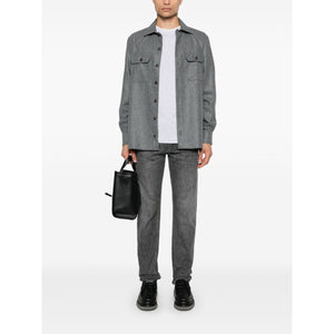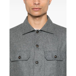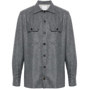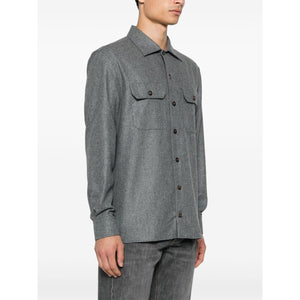 battleship grey virgin wool mélange effect brushed finish classic collar front button fastening long sleeves buttoned cuffs two button-fastening chest pockets straight hem Wool shirt