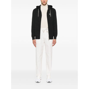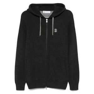 Grey, ribbed knit, drawstring hood, front zip fastening, side patch pockets, long sleeves. Cashmere zipped hoodie