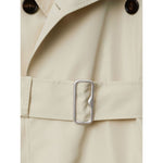 light beige silk notched lapels double-breasted button fastening belted waist storm flap long sleeves belted cuffs straight hem Silk short trench coat Size and Fit - This piece fits true to size. We recommend you get your regular size. Model is 1,75m / 5ft 8in wearing size 8 (UK)