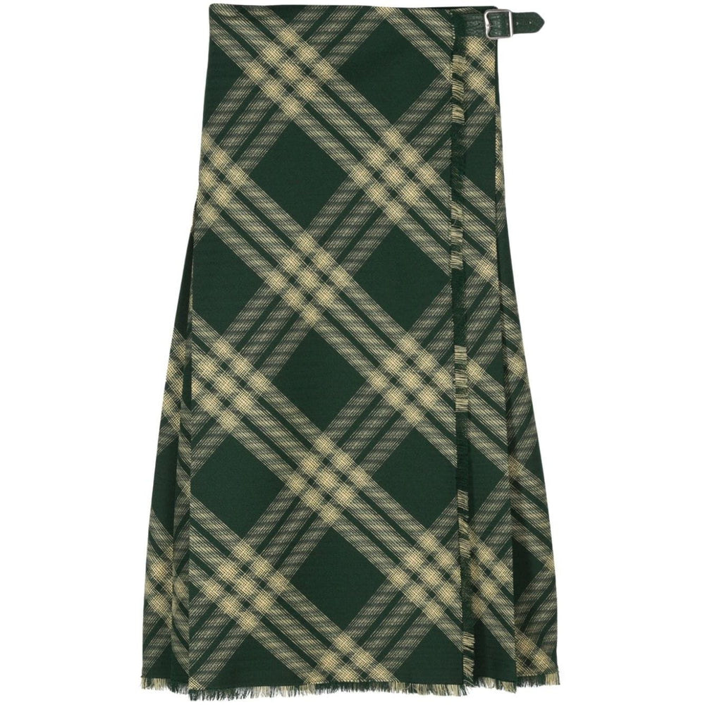 forest green/yellow wool interlock weave all-over check pattern wrap design pleat detailing frayed edge mid-length straight hem side buckle fastening Wool midi skirt Size and Fit - This piece fits true to size. We recommend you get your regular size. Model is 1,75m / 5ft 8in wearing size 8 (UK)