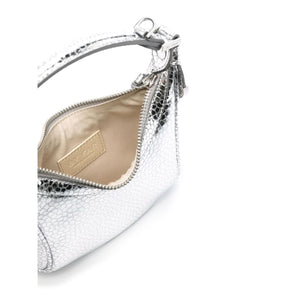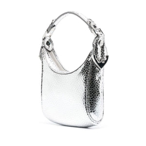 Cosmo metallic top-handle bag from BY FAR featuring silver-tone, goatskin, metallic effect, textured finish, silver-tone hardware, single flat top handle, top zip fastening, adjustable detachable shoulder strap, internal logo patch and cotton lining. Cosmo metallic leather handbag Size and Fit - Width 6,3 in / 16 cm