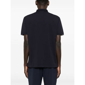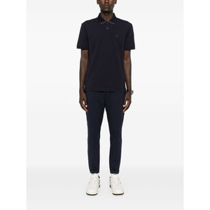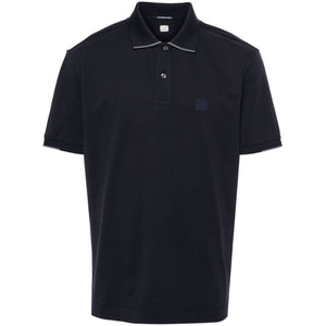navy blue cotton blend piqué weave stretch-design polo collar short sleeves logo print at the chest short side slits straight hem short front button fastening Logo cotton polo shirt Size and Fit - This piece fits true to size. We recommend you get your regular size. Model is 1,84m / 6ft 1in wearing size M