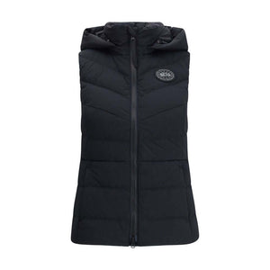 The Clair Black Label padded Vest by Canada Goose features a removable hood with adjustable inner drawstring and two-way zipper. It features a tricot suede chin guard, two exterior zippered hand pockets and fleece lining, as well as an interior zippered security pocket, combining practicality and comfort.