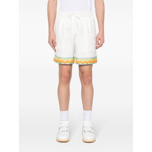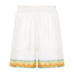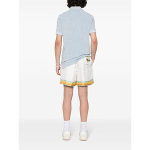 white/multicolour silk twill weave elasticated waistband two side slash pockets rear patch pocket contrasting border Afro Cubism Tennis Club print detail at the rear pocket and border drawstring waist Drawstring silk shorts Size and Fit - This piece fits true to size. We recommend you get your regular size. Model is 1,84m / 6ft 1in wearing size M