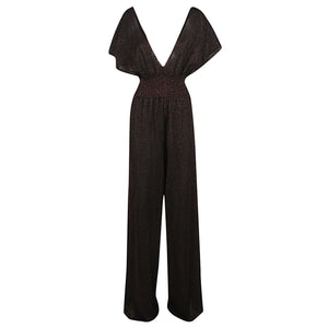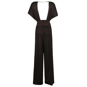 Lurex viscose blend overall. Wide neckline on both front and back sleeve. Rhinestone chain detail on the back. Widely flared trousers. Regular fit. Wide leg jumpsuite Size and Fit - This piece fits true to size. We recommend you get your regular size. Model is 1,75m / 5ft 8in wearing size 40 (IT)