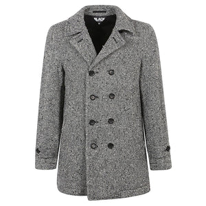 Black/white, V-neck with lapels, front button closure, long sleeves with buttons on the cuffs, back vent, straight hem. Wool double-breasted coat