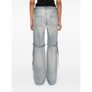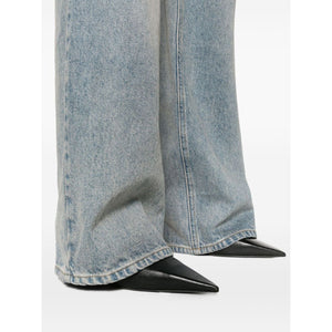 light blue cotton washed denim whiskering effect at the thighs embroidered logo to the rear strap detailing high-rise belt loops concealed fly and button fastening classic five pockets wide leg Baggy denim jeans Size and Fit - This piece fits true to size. We recommend you get your regular size. Model is 1,75m / 5ft 8in wearing size 36 (FR)
