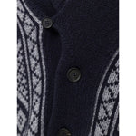 Cruciani Blue Cashmere Cardigan. Contrasting workmanship in grey, shawl collar, two front pockets, button closure, soft to the touch. Composition: 100% Cashmere