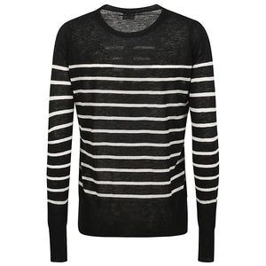 Crew neck sweater, long sleeves, ribbed hems, striped pattern and straight cut. Wool striped sweater Size and Fit - This piece fits true to size. We recommend you get your regular size. Model is 1,75m / 5ft 8in wearing size 36 (FR)