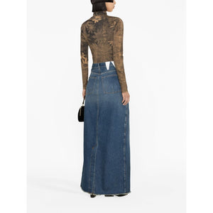 denim maxi skirt from DARKPARK featuring denim, mid-rise, button fly fastening, classic five pockets, front slit, rear slit, long length, blue and belt loops. Emma denim long skirt Size and Fit - This piece fits true to size. We recommend you get your regular size. Model is 1,75m / 5ft 8in wearing size 27 (WAIST CM)