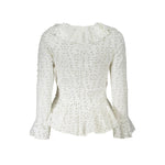 long sleeve blouse, "v" neckline, elastic cuffs, contrasting details, logo