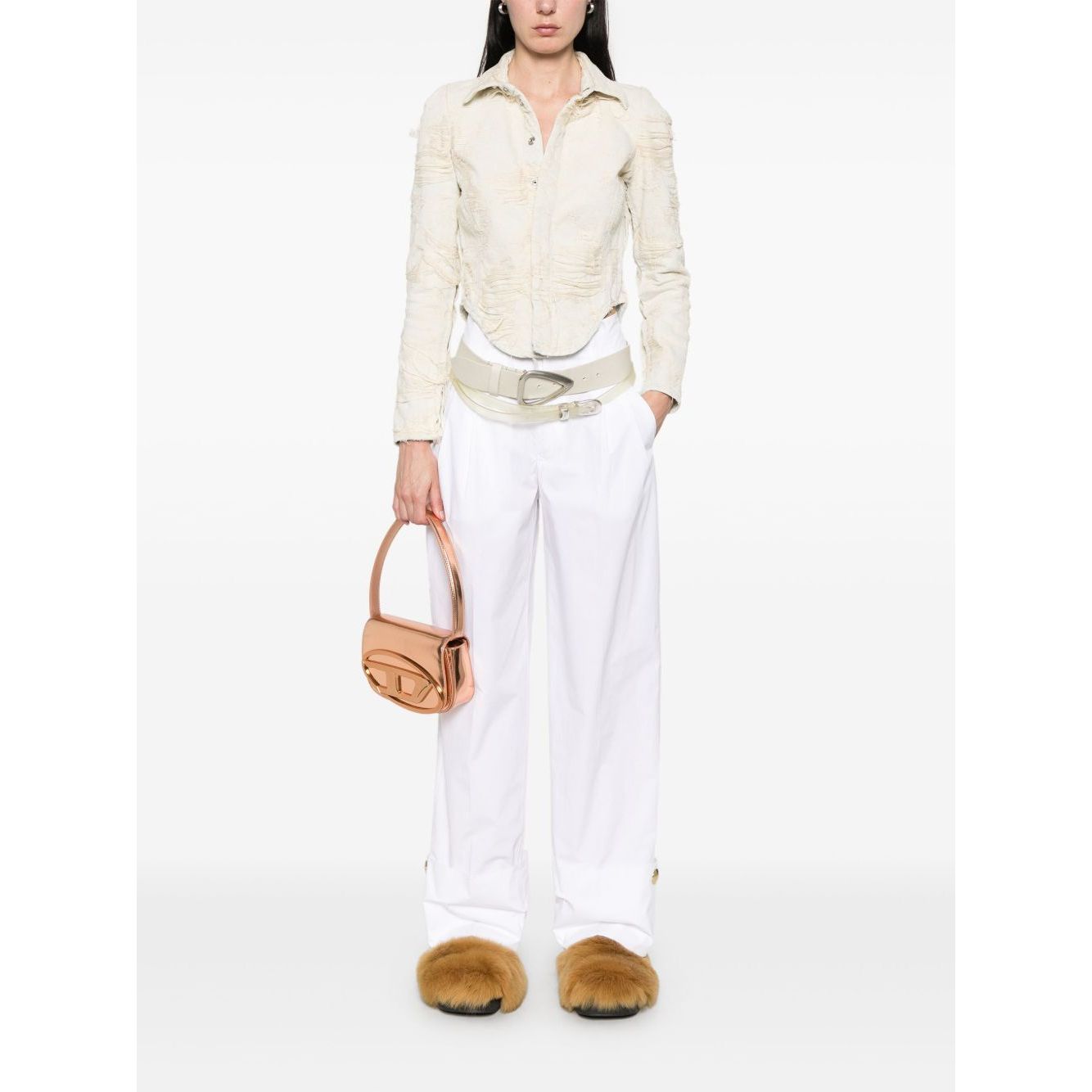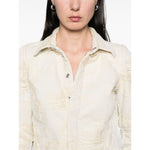 almond beige concealed front press-stud fastening distressed effect long sleeves curved hem Denim cotton shirt Size and Fit - This piece fits true to size. We recommend you get your regular size. Model is 1,75m / 5ft 8in wearing size S