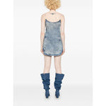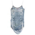 cerulean blue concealed side hook and zip fastening spaghetti straps sleeveless frayed detailing Denim print mini dress Size and Fit - This piece fits true to size. We recommend you get your regular size. Model is 1,75m / 5ft 8in wearing size S