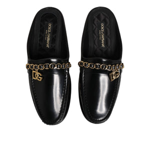 Gorgeous brand new, 100% Authentic Dolce & Gabbana slip on open-back shoes come in calfskin upper with a gold tone chain GD logo band.