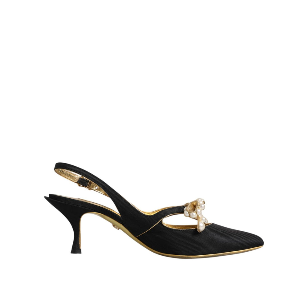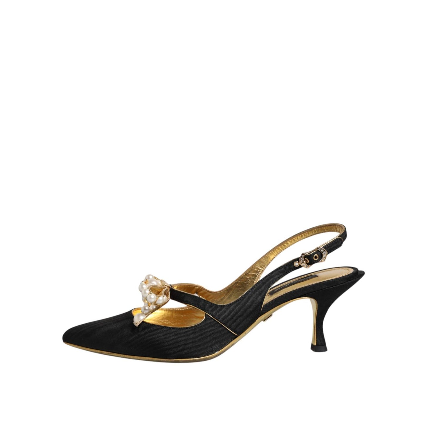 Dolce & Gabbana Black Leather Faux Pearls Slingbacks Shoes