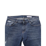 Crafted in Italy from premium blue cotton denim, these skinny fit jeans feature subtle distressed detailing on the legs, giving them a modern and stylish edge. The jeans come with a classic five-pocket design, button and zip closure, and a slim silhouette for a flattering fit.