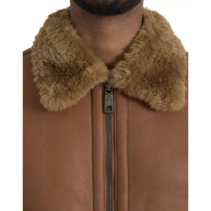 Dolce & Gabbana Brown Leather Fur Button Biker Coat Jacket
