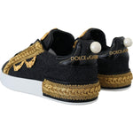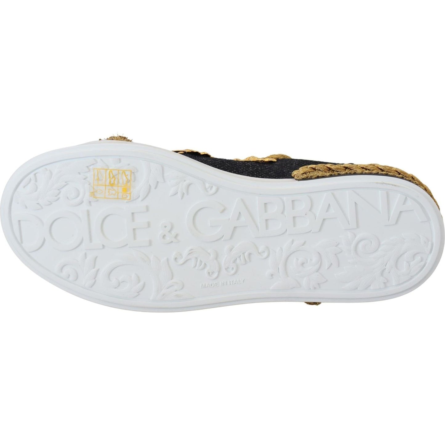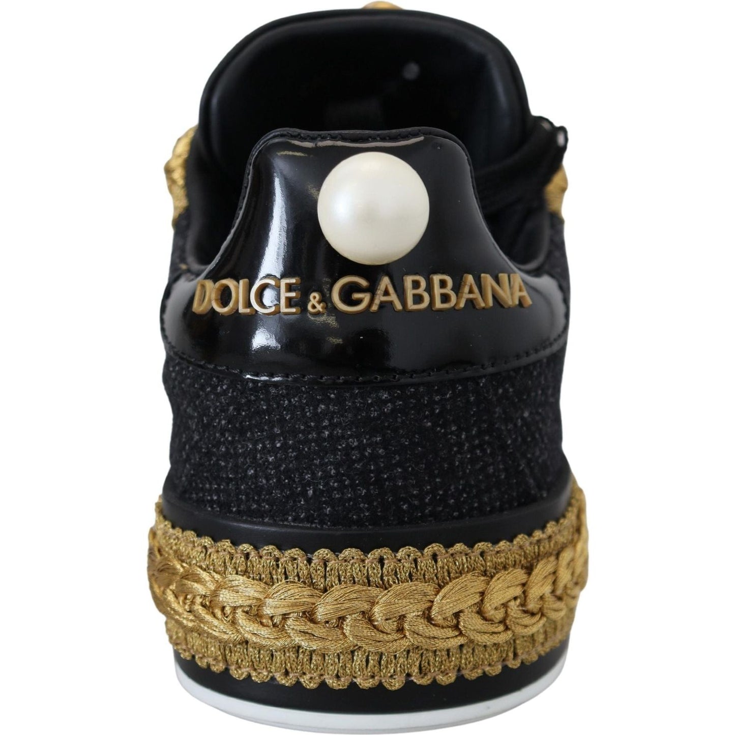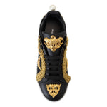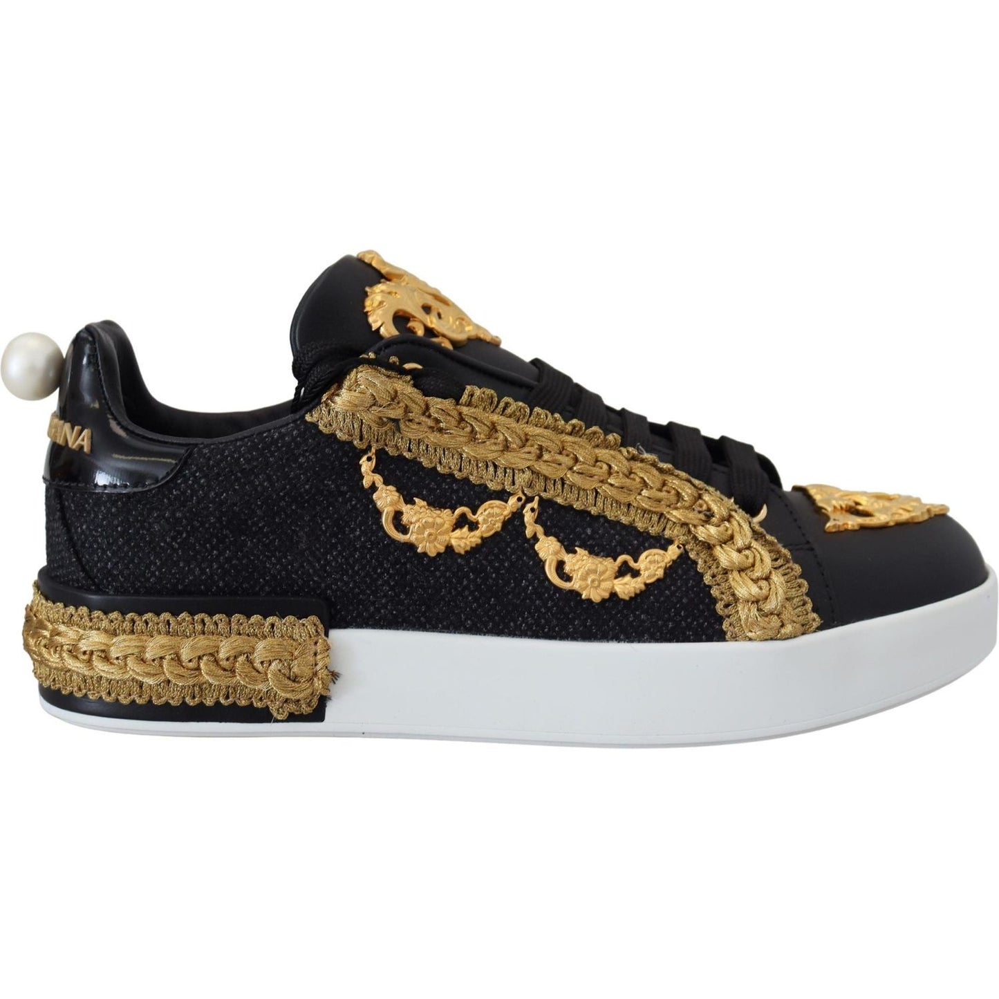 Dolce & Gabbana Black Gold Baroque Portofino Leather Sneakers Shoes