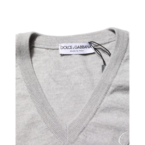 Dolce & Gabbana Gray Wool Knit Logo V-Neck Pullover Sweater
