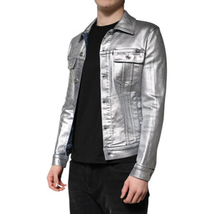 Dolce & Gabbana Silver Cotton Button Down Denim Biker Jacket