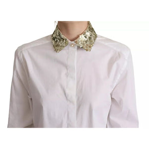 Dolce & Gabbana White Cotton Collared Long Sleeves Sequin Top Shirt