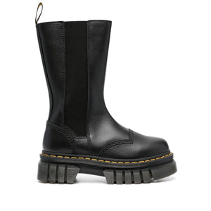 Audrick Tall nappa leather boots from DR. MARTENS featuring jet black, nappa leather, contrast stitching, elasticated side panels, logo pull-tab at the heel, round toe, short side zip fastening and rubber sole. Audrick chelsea tall boots Size and Fit - Heel 2 in / 5 cm; Platform 1,4 in / 3,5 cm