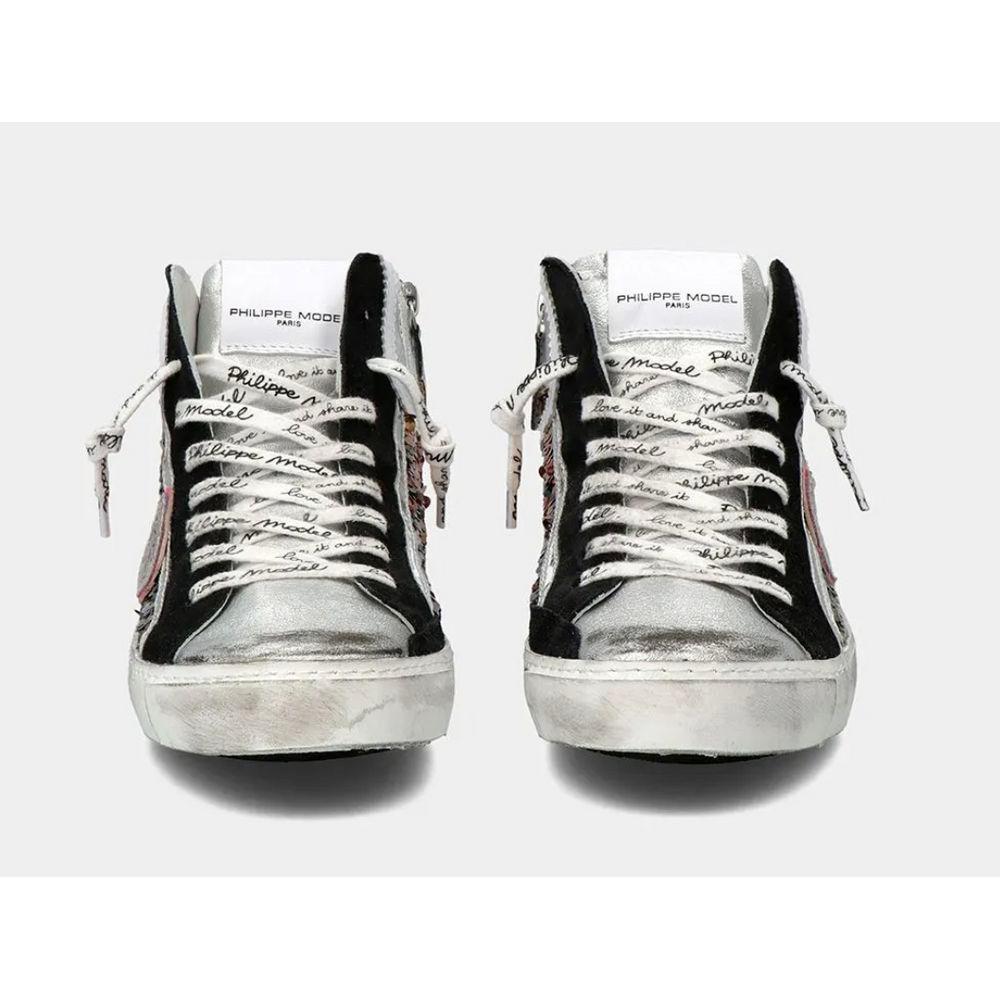 这款时尚的灰色皮革运动鞋饰有别致的银色皮革嵌件和闪亮的亮片细节,让您步入优雅的殿堂。独特的品牌标志优雅地点缀在鞋舌和鞋后跟上,彰显其设计师品质。这款运动鞋采用意大利精湛工艺制作而成,是舒适和奢华的典范。