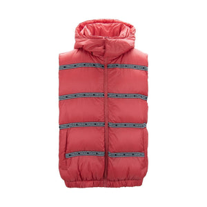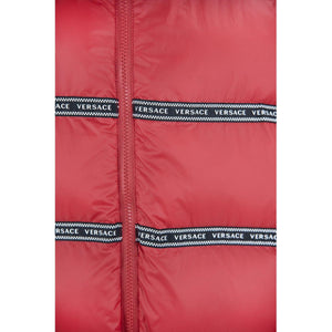 Discover opulence in outerwear with this stunning, brand new Versace vest. A harmonious blend of style and warmth, this piece boasts black bands adorned with the iconic white ‘Versace’ logo and a hood that promises versatility with its snap button closure, easily removable by zip. The vest’s elasticated bottom ensures a snug fit while making a statement in its vibrant red hue.
