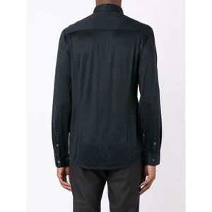 navy blue cotton-lyocell blend straight-point collar front button fastening long sleeves buttoned cuffs curved hem Cotton blend shirt