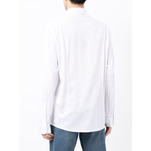 White lyocell-cotton blend jersey long-sleeve shirt from EMPORIO ARMANI featuring spread collar, front button placket, buttoned-cuff sleeves and curved hem. POSITIVELY CONSCIOUS: This Planet Conscious product contains at least 50% eco-materials, which are independently certified as or widely recognised for having a lower environmental impact.. Cotton shirt Size and Fit - This piece fits true to size. We recommend you get your regular size. Model is 1,84m / 6ft 1in wearing size M