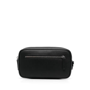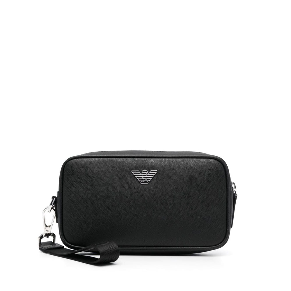 Eagle-plaque zipped wash bag from EMPORIO ARMANI featuring black, textured finish, silver-tone logo plaque, top zip fastening, silver-tone hardware, detachable wrist strap, main compartment and multiple internal slip pockets. Logo beauty-case Size and Fit - Width 8,66 in / 22 cm Height 4,72 in / 12 cm Depth 2,36 in / 6 cm Handle 7,09 in / 18 cm