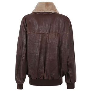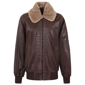 Dark brown colour, solid colour, made of leather, collar with fur, long sleeves with cuff, front zip closure, raised stitching for decoration, two side welt pockets, patch pocket on the left sleeve with zip closure, internal lining, straight hem. Vivienne leather jacket Size and Fit - This piece fits true to size. We recommend you get your regular size. Model is 1,75m / 5ft 8in wearing size 36 (FR)