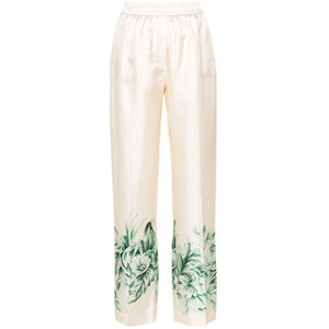 blush beige silk twill weave palazzo design elasticated waistband with internal drawstring piped-trim detailing two diagonal pockets to the sides floral print wide leg Silk printed trousers Size and Fit - This piece fits true to size. We recommend you get your regular size. Model is 1,75m / 5ft 8in wearing size S