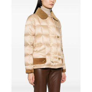 blush beige feather down padded design quilted leather trim corduroy collar concealed front fastening and hook fastening long sleeves contrasting cuffs two side flap pockets Nylon down jcket Size and Fit - This piece fits true to size. We recommend you get your regular size. Model is 1,75m / 5ft 8in wearing size S