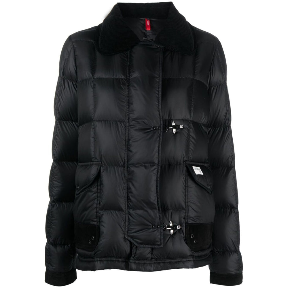 classic-collar quilted down jacket from FAY featuring black, goose down, quilted, padded design, suede trim, logo patch to the front, corduroy collar, classic collar, hook fastening, long sleeves, two press-stud fastening side pockets and straight hem. Nylon down jacket Size and Fit - This piece fits true to size. We recommend you get your regular size. Model is 1,75m / 5ft 8in wearing size S