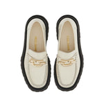 Gancini-plaque leather loafers from Ferragamo featuring ivory white, calf leather, smooth grain, penny slot, Gancini plaque, tonal stitching, round toe, slip-on style, branded leather insole and ridged rubber sole. Gancio leather loafers Size and Fit - Our boutique offers the following fittings: M (medium) for sporty women shoes and C (wide) for classic women shoes. Do not hesitate to contact us to have more information.