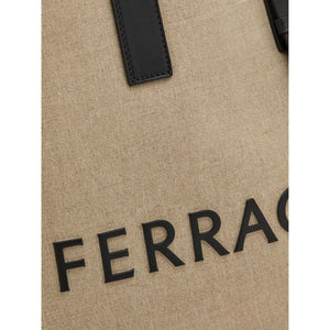 logo-embossed leather tote bag from Ferragamo featuring sand beige, black, calf leather, canvas, embossed logo to the front, leather trim, removable pouch, open top, two adjustable top handles and main compartment. Logo canvas tote Size and Fit - Width 16,93 in / 43 cm
