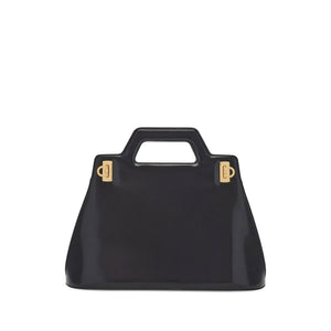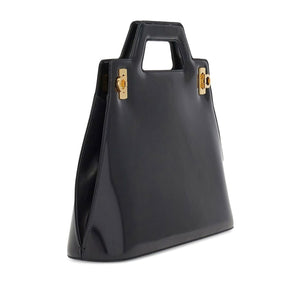 Intense black, veal leather, swivel closure gancini, handle with design cut out, unique compartment and gold -colored details. Wanda leather top-hndle bag Size and Fit - Width 14,17 in / 36 cm