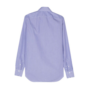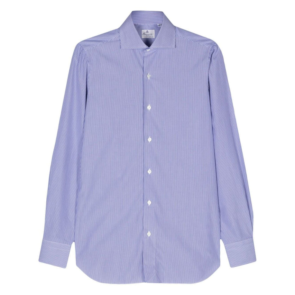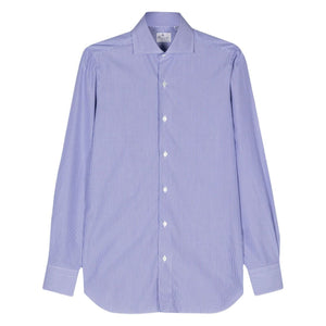 periwinkle blue/white cotton poplin texture front button fastening vertical stripe pattern wingtip collar long sleeves with buttoned cuffs curved hem Napoli cotton shirt Size and Fit - This piece fits true to size. We recommend you get your regular size. Model is 1,84m / 6ft 1in wearing size 39 (COLLAR CM)