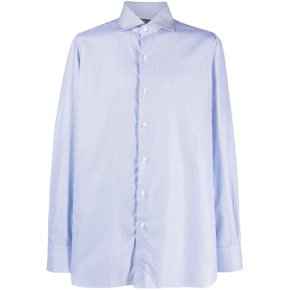 Blue shirt, striped, buttons closure. Striped cotton shirt Size and Fit - This piece fits true to size. We recommend you get your regular size. Model is 1,84m / 6ft 1in wearing size 39 (COLLAR CM)