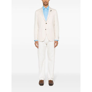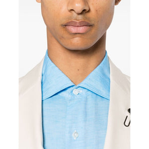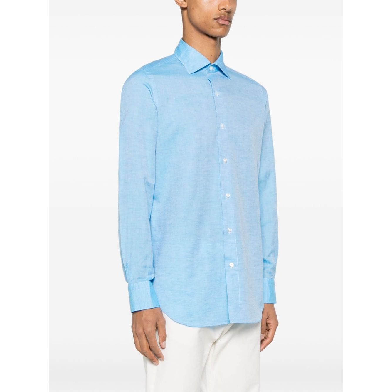 sky blue cotton-linen blend spread collar long sleeves with buttoned cuffs curved hem front button fastening Cotton and linen blend shirt Size and Fit - This piece fits true to size. We recommend you get your regular size. Model is 1,84m / 6ft 1in wearing size 39 (COLLAR CM)