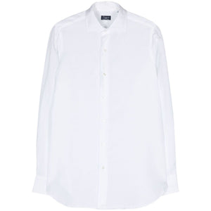 white cotton-linen blend semi-sheer construction classic collar front button fastening long sleeves buttoned cuffs hem gusset curved hem Cotton and linen blend shirt Size and Fit - This piece fits true to size. We recommend you get your regular size. Model is 1,84m / 6ft 1in wearing size 39 (COLLAR CM)