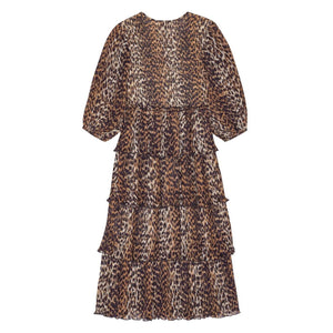 Ganni Leopard Pleated Georgette Flounce Smock Midi Dress