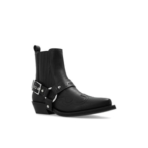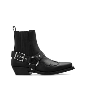 black faux leather Western style slip-on style pull-tab at the heel elasticated side panels silver-tone buckle fastening embroidered design pointed toe low block heel branded insole rubber sole ankle-length We've partnered with Good On You — an independent agency that rates how brands perform in relation to their impact on the planet, people and animals, with a multi-criteria rating simplified to a five points scale. In order to be awarded our conscious label, larger brands need to score a minimum of four out of five ('Good'), while smaller brands must score at least three out of five ('It's A Start'). This item comes from a brand rated three out of five ('It's A Start') by Good on You at the time it was added on FARFETCH. Please note, this is a brand-level rating and does not guarantee that this product is made with conscious materials. Learn more about what makes a product Conscious on our Conscious Criteria page Chelsea western boots Size and Fit - Heel 1,6 in / 4 cm