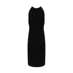 Givenchy’s midi Dress is an elegant and bold piece with a design that enhances femininity. Its halter neckline is embellished with a chain, while the cut-out detail on the front and deep V-neck add a sensual touch. The midi length and wide front slit lend a fluid movement to the look. The sleeveless pattern and double-breasted design with drape on the front complete the look, creating a sophisticated and dynamic silhouette perfect for special occasions.