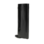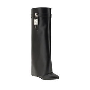 Givenchy’s Shark Lock Boots strike a perfect balance between contemporary elegance and bold sophistication. Crafted from fine smooth calfskin, the wide-cut tube style wraps the leg with a bold and sophisticated design. The leather band with metal closure, embellished with 4G Lock in silver finish on the right side and GIVENCHY metal lock with gold and silver finish on the left side, lends a distinctive and luxurious touch. The almond toe and covered wedge heel complete the look with elegance while offering comfort and stability.