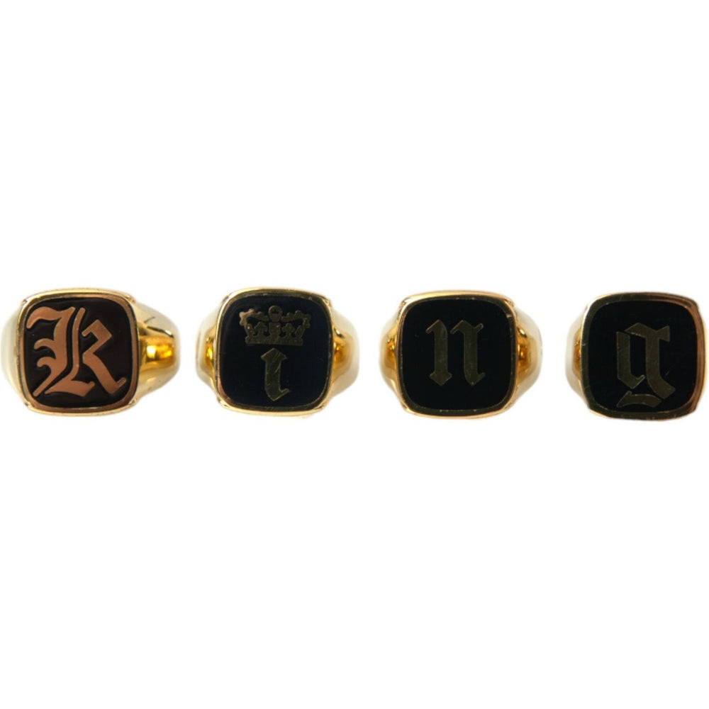 精美全新,带标签,100% 正品 Dolce & Gabbana 金色黄铜印章戒指四件套。黑色珐琅饰面,表面字母不匹配。