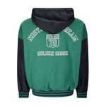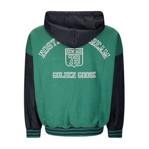 forest green front zip fastening two side flap pockets stripe trim slouchy drawstring hood Organic cotton reversbile hoodie Size and Fit - This piece fits true to size. We recommend you get your regular size. Model is 1,84m / 6ft 1in wearing size M